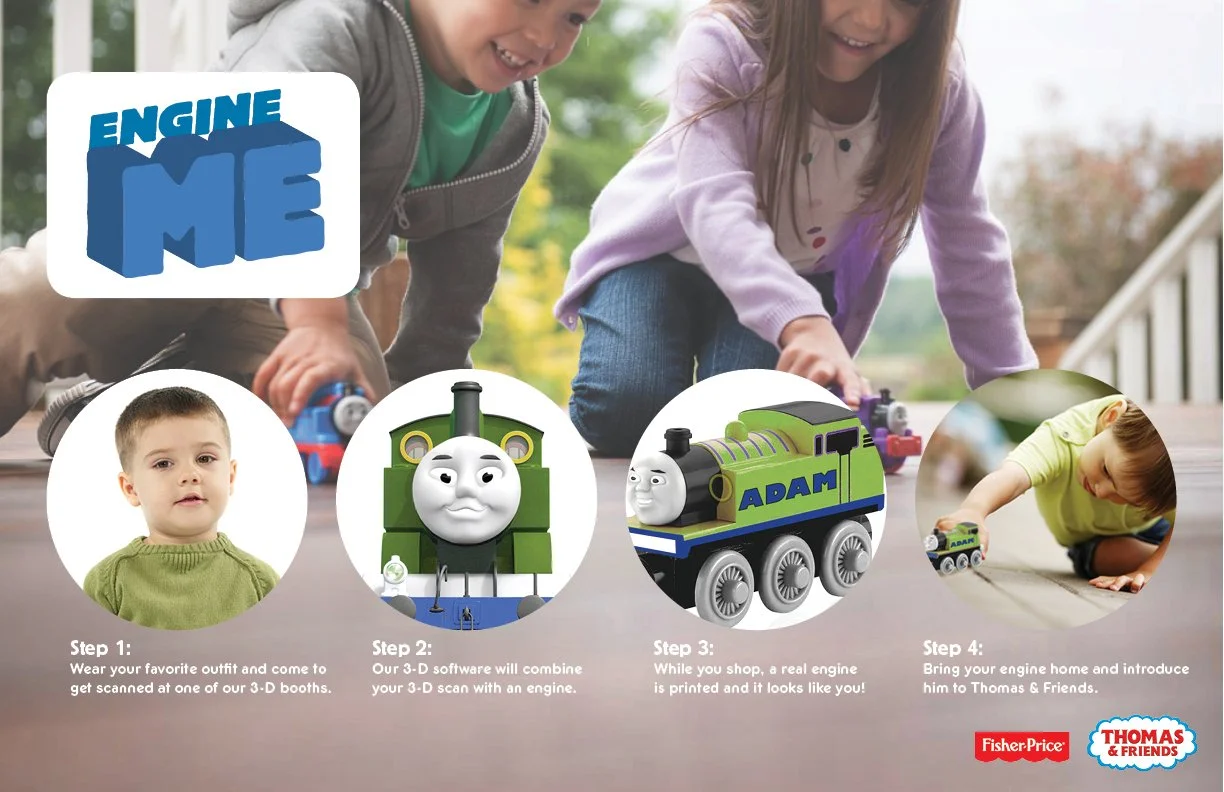 Engine Me combines 3-D printing technology with personalization. Engine Me gives boys a new and physical relationship with Thomas & Friends.