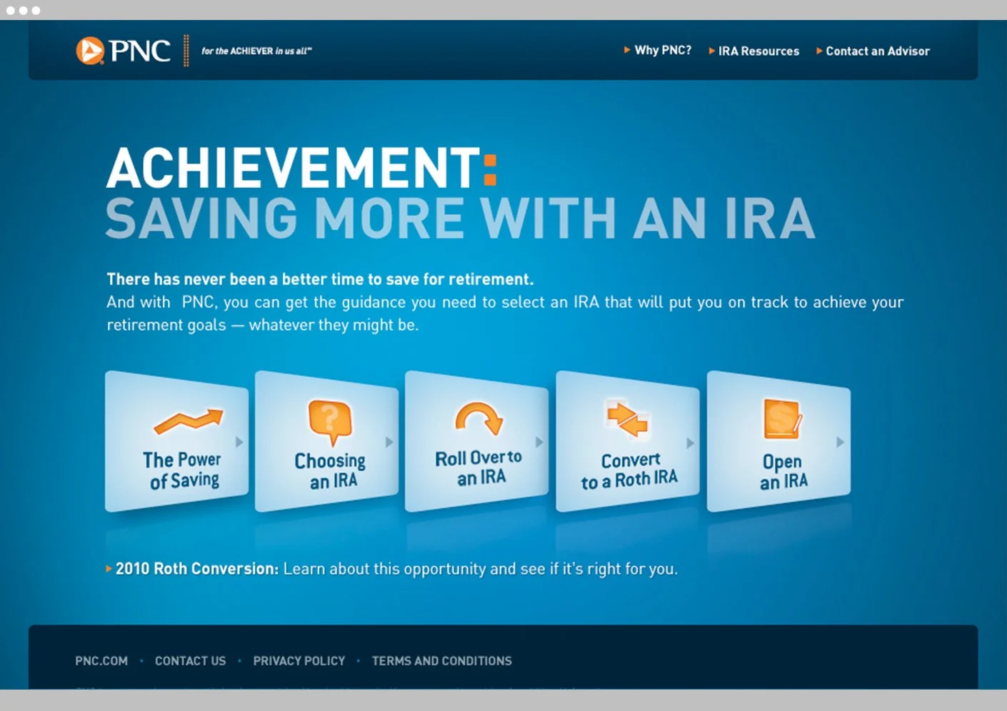 PNC bank believes that achievement comes in all shapes and sizes. For the launch of the new campaign, we created a website that highlights various life milestones as achievements. The full-bleed photography and unconventional navigation made the site a launch-worthy event.